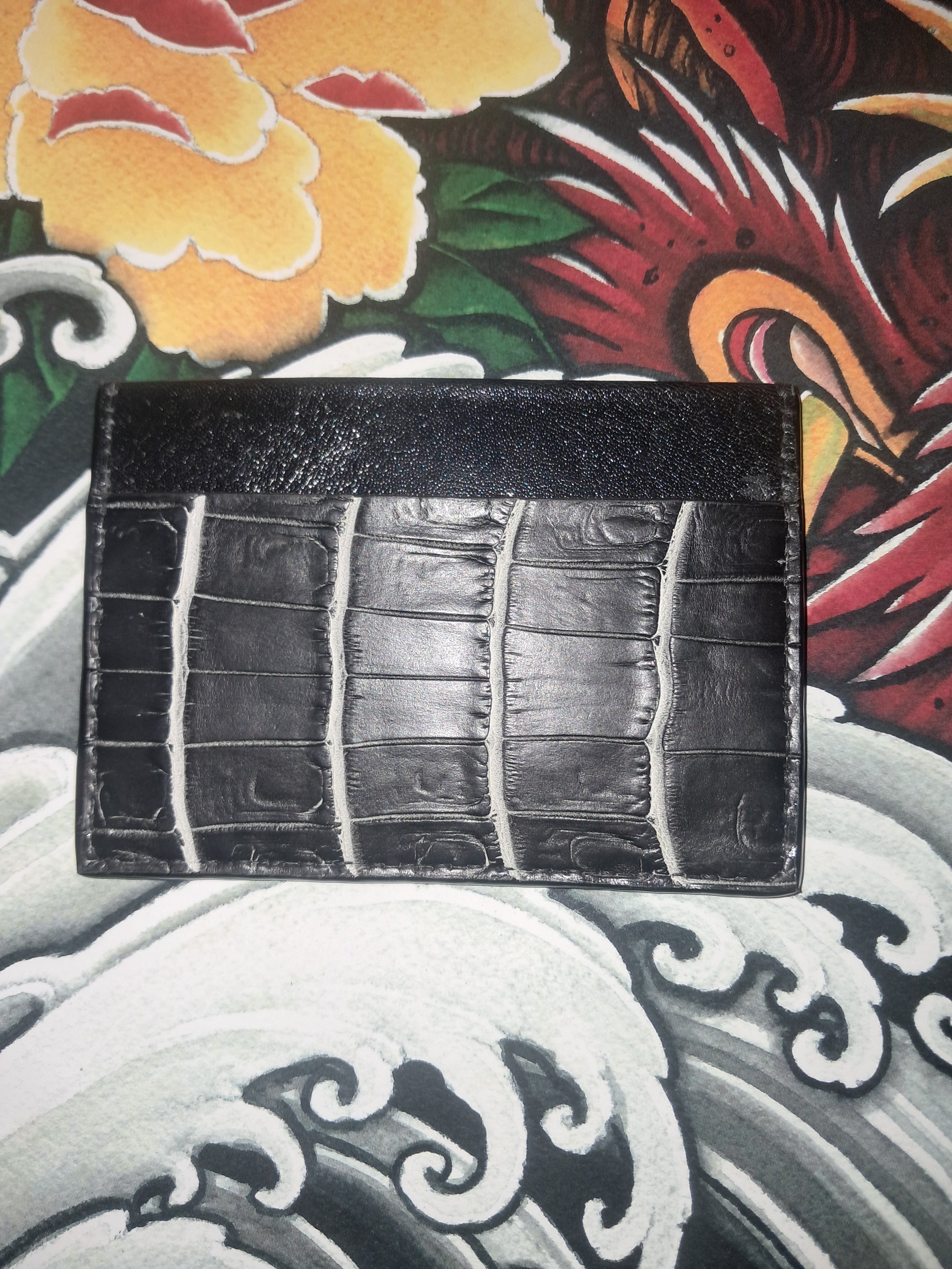 Two tone black Nile crocodile with kangaroo lining hand crafted using no machines and carries a lifetime guarantee