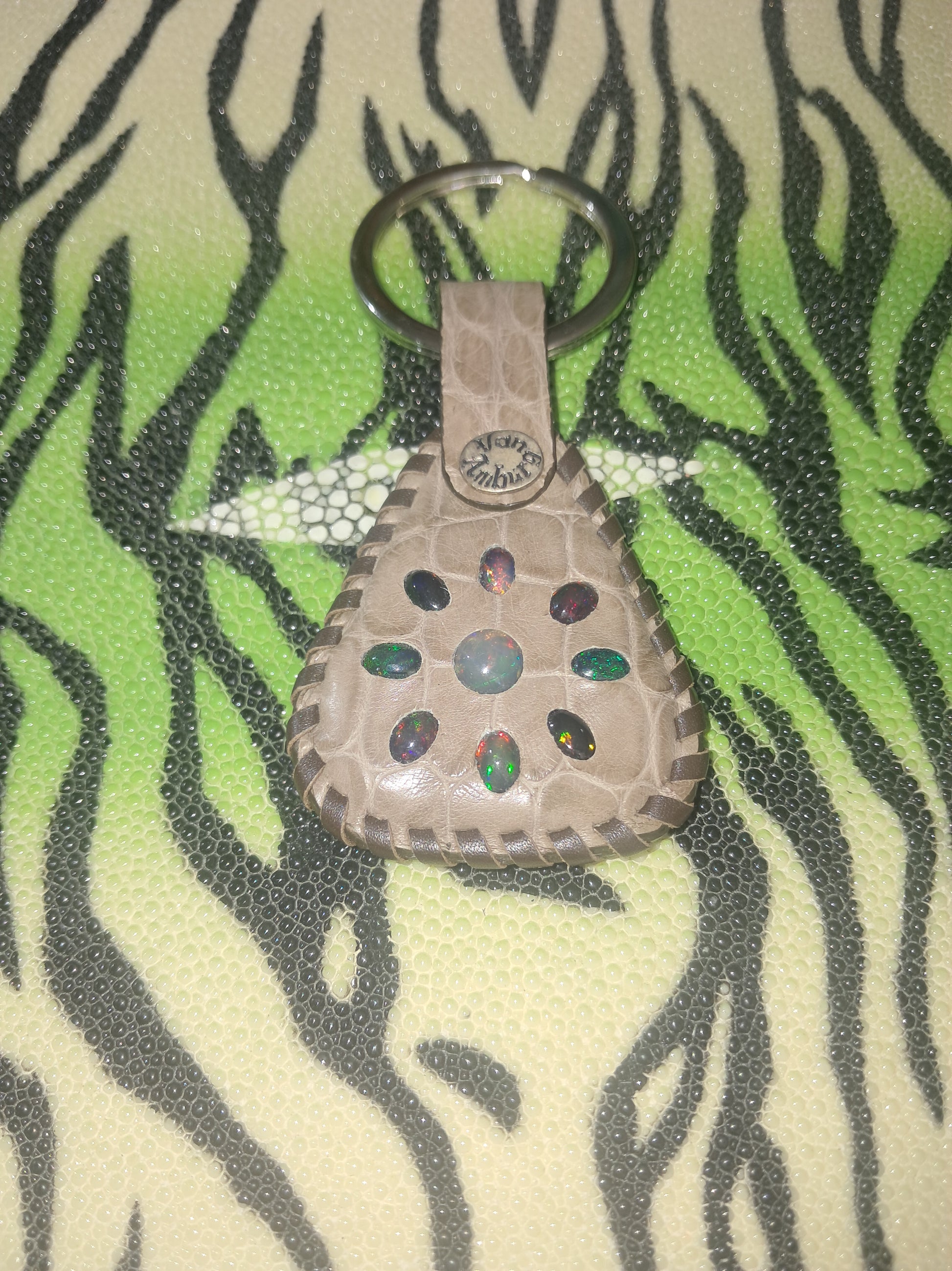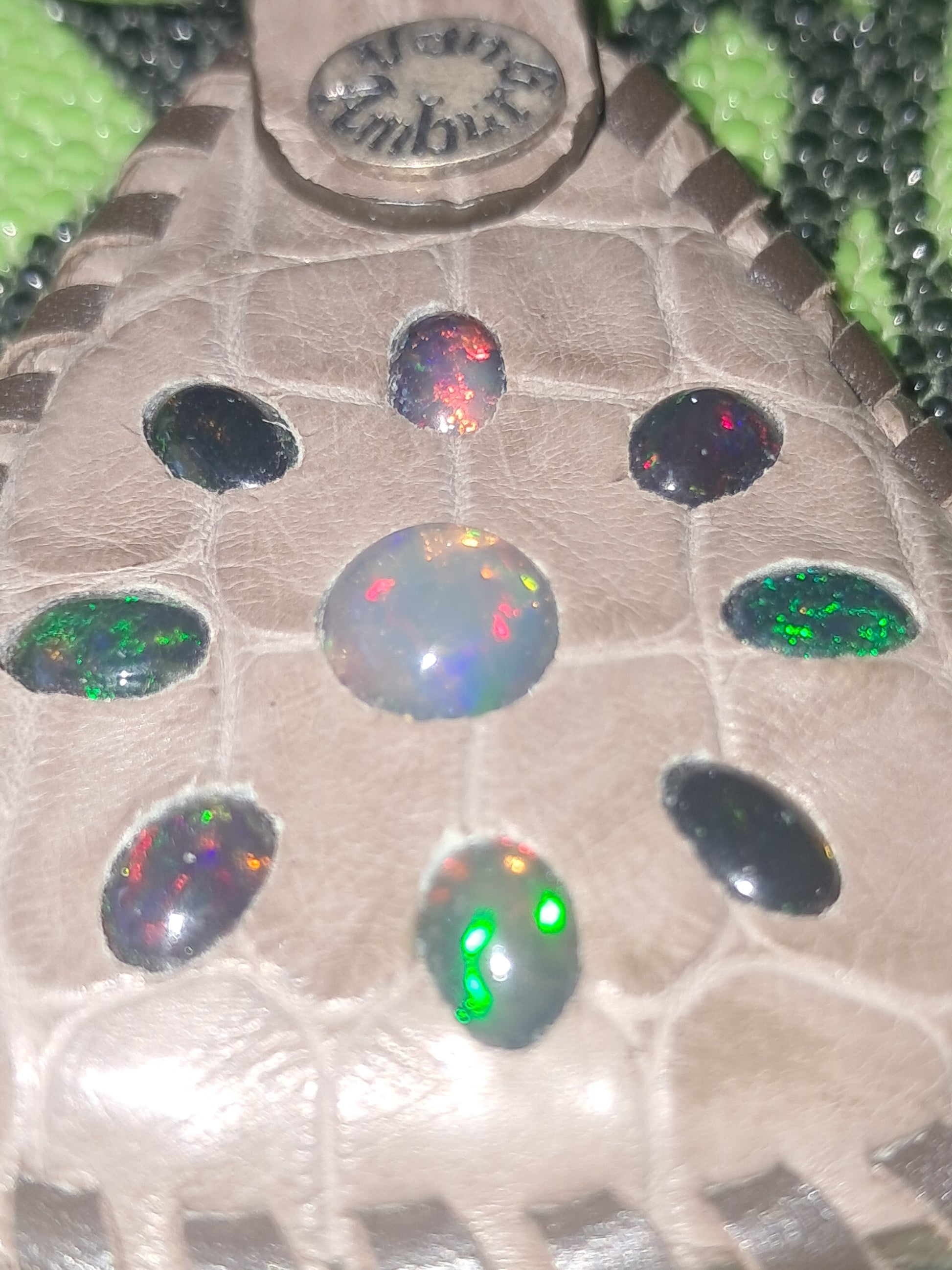 Ethiopian Welo black opals inlayed in crocodile with kangaroo backing and lace hand crafted using no machines and carries a lifetime guarantee